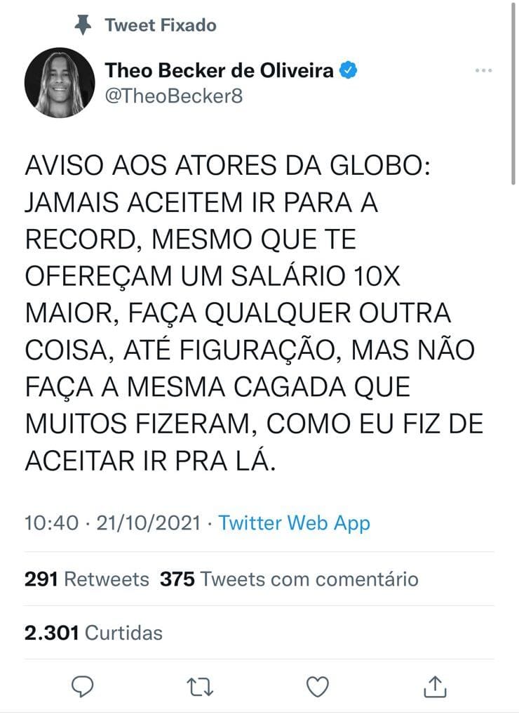Em seu twitter o ator que fez parte do “casting” da Rede Record há alguns anos mandou um recado aos atores globais: “Aviso aos atores da Globo: Jamais aceitem ir para a Record, mesmo que te ofereçam um salário 10X maior, faça qualquer outra coisa, até figuração, mas não faça a mesma cagada que muitos fizeram, como eu fiz de aceitar ir pra lá.”