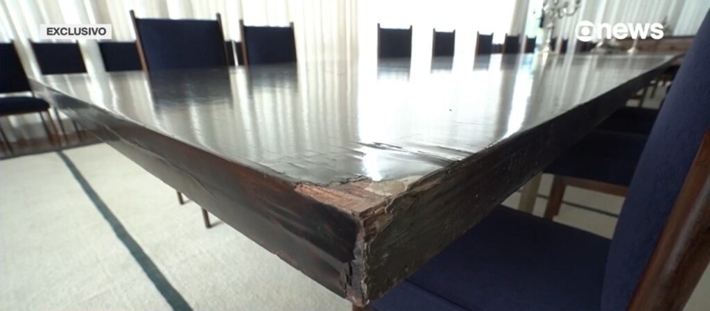Ainda na sala de recepção do Palácio, a primeira-dama notou a falta de duas esculturas que foram removidas do ambiente e colocadas em outro lugar. “As coisas parecem que foram meio que colocadas aqui meio de improviso. O piso está muito deteriorado. O que a gente percebe é que não teve cuidado, manutenção. Os pés dos móveis que são de latão não estão polidos. Os móveis não são os originais. A gente vai tentar recuperar isso, eu ainda preciso fazer uma visita no depósito. A presidência da república tem um depósito de móveis, preciso ver o que foi para lá. Teve muitos objetos que foram transportados de um lado para o outro. Do Planalto para cá, daqui para Jaburu. Então, a gente precisa localizar esses objetos”, disse Janja para Natuza.