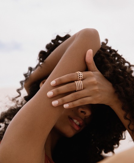 As novas jóias contam com cores e designs que fazem referências visuais à natureza através do verde das esmeraldas, roxo das tanzanitas e diversidade de tons azuis nas turmalinas paraíbas, topázio sky e água marinha, com as três cores de ouro, rosa, amarelo e branco. Presente também, estão o coral peaux d’ange e os eternos diamantes. As texturas das peças são destaque graças ao seu trabalho único e artesanal.