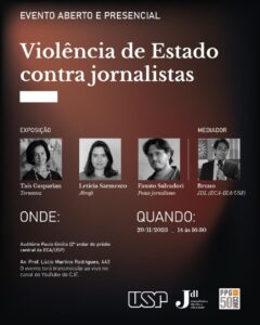 O debate “Violência de Estado contra jornalistas” acontece no dia 29 de novembro, das 14h às 16h30, no Auditório Paulo Emílio (2º andar do prédio central da ECA/USP), na Avenida Prof. Lúcio Martins Rodrigues, 443. Evento terá transmissão ao vivo pelo canal do CJE no YouTube.