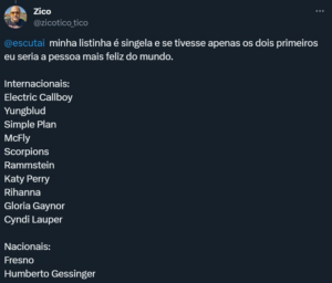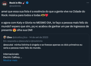 Na noite desta terça-feira, 06 de fevereiro, o perfil oficial do Rock in Rio no Twitter/X anunciou que estava dando um par de ingressos para um jovem assistir aos shows das cantoras Katy Perry e Gloria Gaynor no festival no dia 20 de setembro deste ano. O jovem em questão, chamado Zico, publicou em setembro de 2023, uma lista de artistas que ele gostaria que se apresentassem no evento, e dentro desta lista estavam as cantoras Katy Perry e Gloria Gaynor.