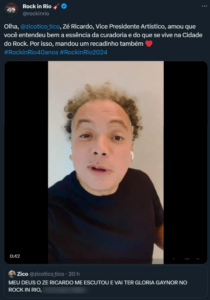 Como forma de reiterar a sua conexão com os fãs, na tarde desta quarta-feira (07), o perfil oficial do evento no Twitter/X publicou um vídeo de Zé Ricardo, vice-presidente artístico da Rock World, empresa que criou, organiza e produz o Rock in Rio e o The Town, declarando: “Salve Zico, você tem nome de craque e um ótimo gosto musical.
