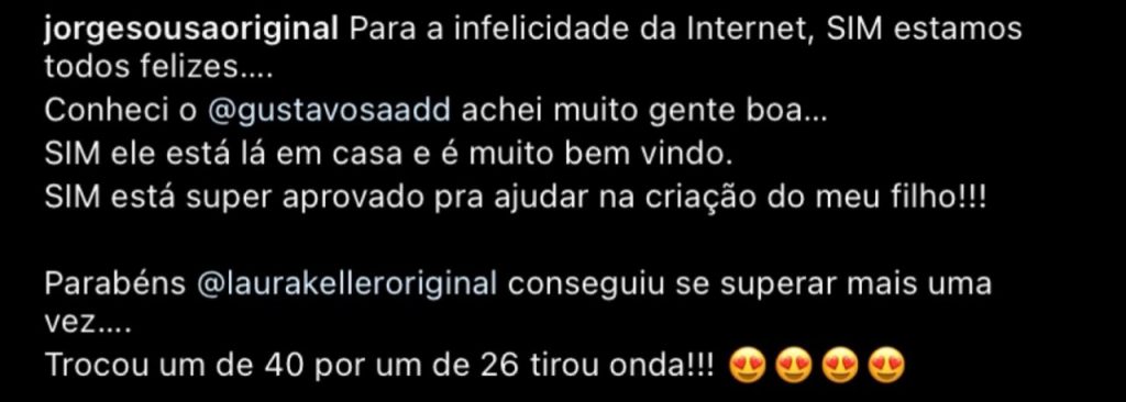 Jorge também postou em seu Instagram vídeos mostrando a ex beijando o atual namorado e brincou: “Está entregue, sem devolução”, disse ele, brincando. “Gente, olha só, somos amigos. O relacionamento acaba e não tem problema. O Gustavo adora criança, estou adorando o jeito que ele está tratando meu filho. Graças a Deus, para o incômodo de muita gente, nós estamos muito felizes”, comemorou. “Aqui é família”, completou Gustavo.