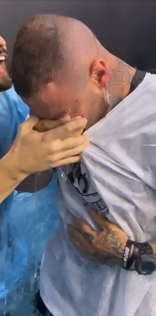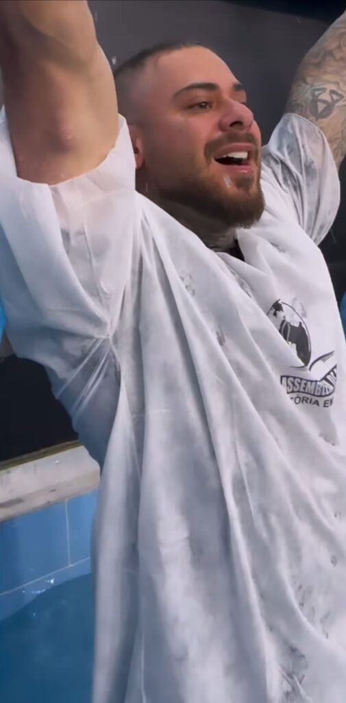 “25 de Junho de 2023, o dia mais importante da minha vida! O dia que publicamente, como manda as escrituras, fui batizado nas águas. O dia do meu sepultamento, o dia em que morri pra mim. O dia que eu nasci em Cristo! Eu venho separando bem a minha vida pessoal das redes sociais, e fiquei me indagando se eu postaria isso aqui ou não… e orei muito sobre isso. e Deus falou comigo: “você passou a sua vida inteira postando as besteiras e bobagens que fazia, porque não postar sobre Deus, sobre seu Senhor, sobre o dia mais importante sua vida!? “A maioria já notou a mudança, os mais próximos se impactaram. e agora é um novo começo, espero estar cada vez mais perto de Jesus e vocês vão continuar acompanhando isso. Ele não esqueceu de mim! Ele também não esqueceu de você! Acredite. toda honra e glória a Deus”., escreveu na legenda.