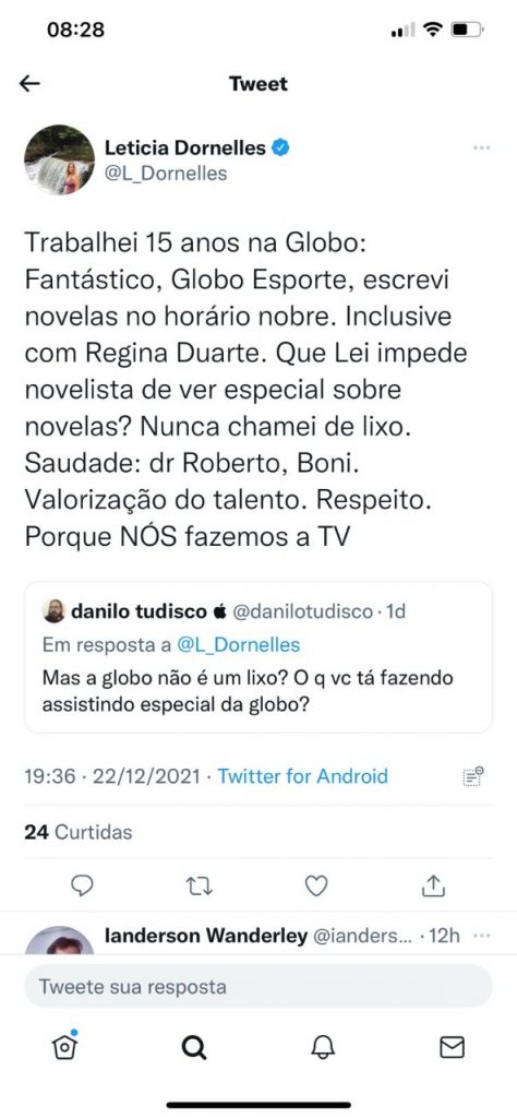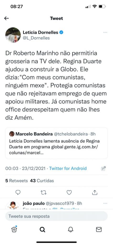 E Letícia continuou: “Dr Roberto Marinho não permitiria grosseria na TV dele. Regina Duarte ajudou a construir a Globo. Ele dizia: “Com meus comunistas, ninguém mexe”. Protegia comunistas que não rejeitavam emprego de quem apoiou militares. Já comunistas home office desrespeitam quem não lhes diz Amém”, contou.