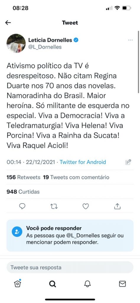 Segundo Dornelles, o problema está na política, afinal de contas, Regina saiu da Rede Globo para ser Secretária da Cultura no Governo Bolsonaro: “Ativismo político da TV é desrespeitoso. Não citam Regina Duarte nos 70 anos das novelas. Namoradinha do Brasil. Maior heroína. Só militante de esquerda no especial. Viva a Democracia! Viva a Teledramaturgia! Viva Helena! Viva Porcina! Viva a Rainha da Sucata! Viva Raquel Acioli!”, se revoltou a autora.