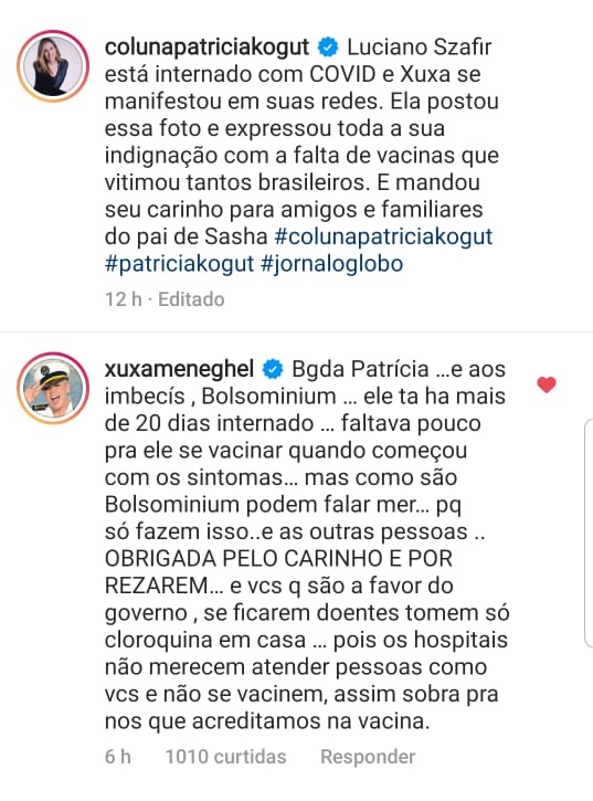 Alguns seguidores apoiadores do governo não gostaram da publicação e criticaram Xuxa nos comentários, mas a rainha não os respondeu. Patrícia Kogut, colunista do O Globo, postou uma foto em seu perfil reforçando o que foi dito por Xuxa, que comentou agradecendo: ”obrigada, Patrícia… E aos imbecis Bolsominium… Ele tá há mais de 20 dias internado… Faltava pouco pra ele se vacinar quando começou com os sintomas… Mas como são Bolsominium podem falar mer… porque só fazem isso. E as outras pessoas… OBRIGADA PELO CARINHO E POR REZAREM. E vocês que são a favor do governo, se ficarem doentes tomem só cloroquina em casa, pois os hospitais não merecem atender pessoas como vocês e não se vacinem, assim sobra pra nós que acreditamos na vacina”.