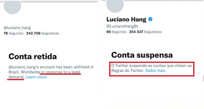 Outro indício de que a suspensão de nova conta é um ato de censura, é a própria definição que a plataforma deu para as ações. No antigo perfil (@Luciano_Hang) diz que a “conta foi retida em resposta a uma demanda legal”. Já agora, consta que a suspensão se deu pela violação das regras do Twitter. Até o presente momento, não houve um parecer da plataforma sobre quais supostas violações teriam sido realizadas pelo perfil.