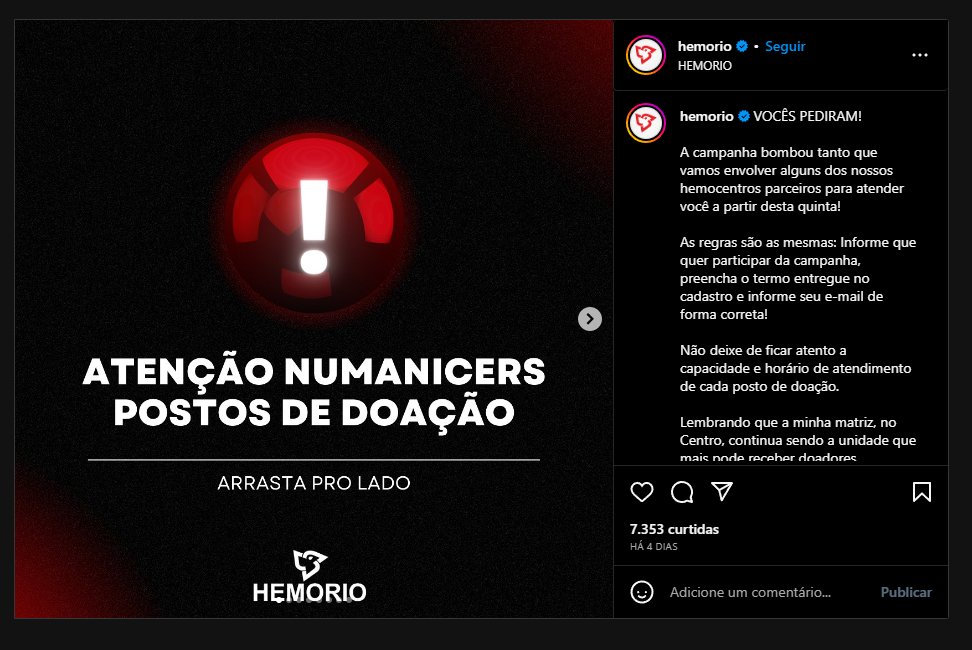 Mais informações, consulte @hemorio ou ligue para o Disque Sangue: 0800 282 0708 – de segunda a sexta-feira, exceto feriados, das 7h às 17h.