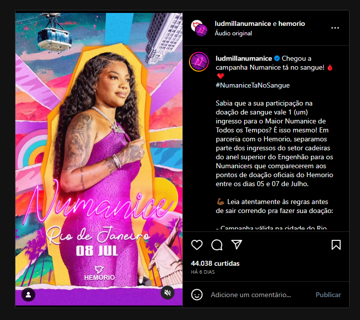 O Hemorio buscou ajuda da cantora Ludmilla para uma ação inédita no Rio de Janeiro: a doação de ingressos para o show “Numanice”, para incentivar as doações de sangue no Rio de Janeiro. O show da cantora, que é um grande sucesso por onde passa, foi a aposta do instituto para uma campanha robusta, afim de abastecer o estoque de sangue do estado do Rio de Janeiro. O anúncio da parceria foi feito na terça-feira (4,) nas redes sociais e no dia seguinte, o Hemorio reuniu um número recorde de doadores.