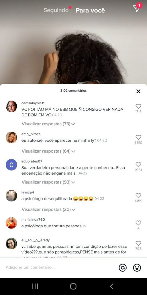 A passagem conturbada da baiana Lumena Aleluia no BBB21 parece que está longe de acabar. No Tik Tok, a participante do reality, que posta vários vídeos dançando, coleciona diversos comentários negativos sobre as polêmicas vividas no jogo. Lumena usou as redes sociais para desabafar sobre os ataques sofridos.