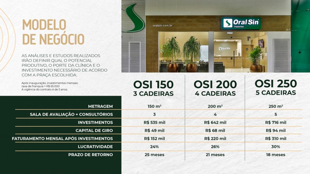 A rede Oral Sin, fundada em 2004, no Paraná, passou a atuar em 2009 no sistema de franquias e oferece três modelos de negócio, com investimento inicial de R$ 535 mil. Além disso oferece todo o suporte ao franqueado, desde a escolha do ponto até a formação dos colaboradores.