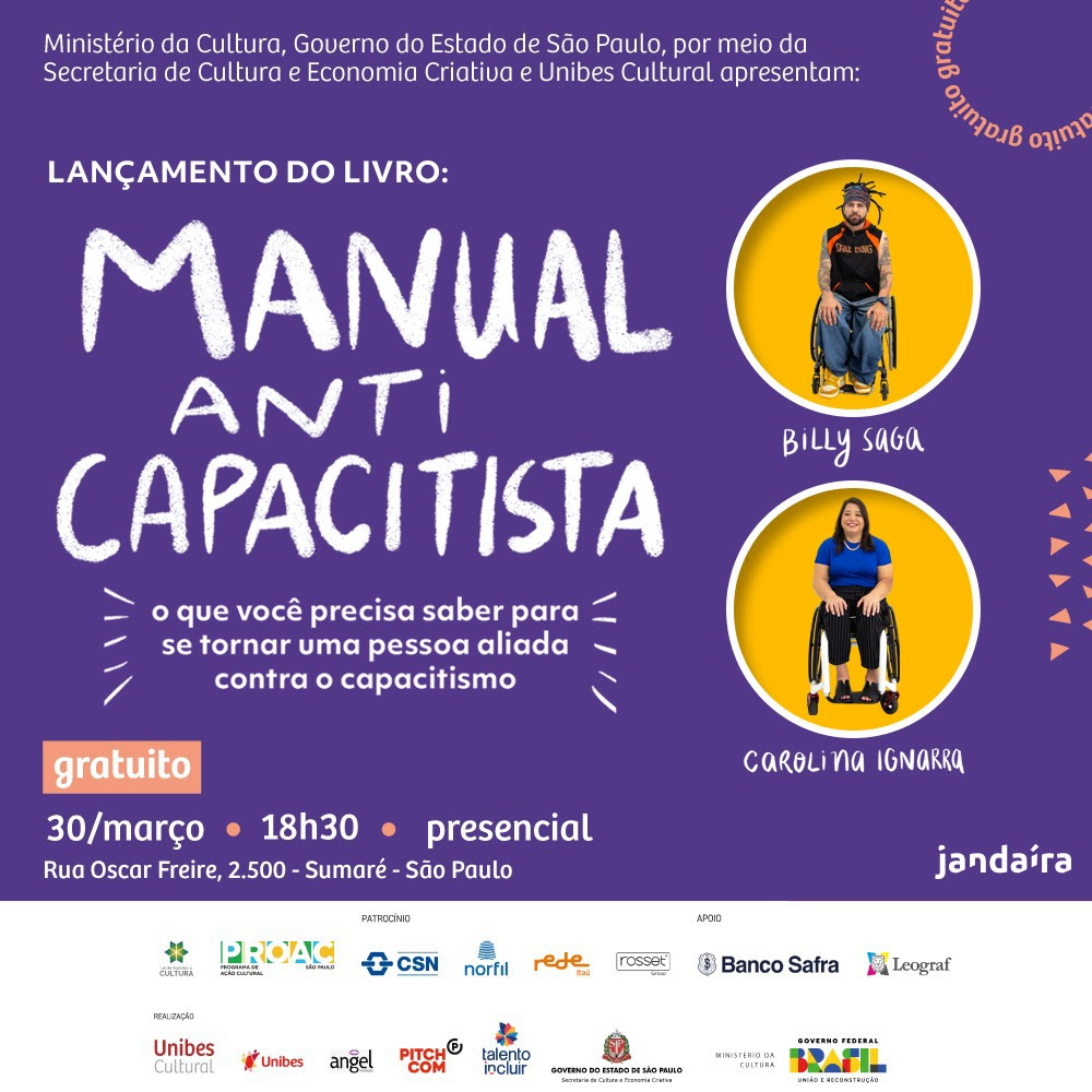 No dia 30 de março de 2023, a cidade de São Paulo será o palco do lançamento do livro “Manual Anticapacitista – O que você precisa saber sobre inclusão de pessoas com deficiência”. O evento, que terá entrada franca mediante cadastro prévio, será realizado às 18h30 no Unibes Cultural, localizado na Rua Oscar Freire, 2.500.