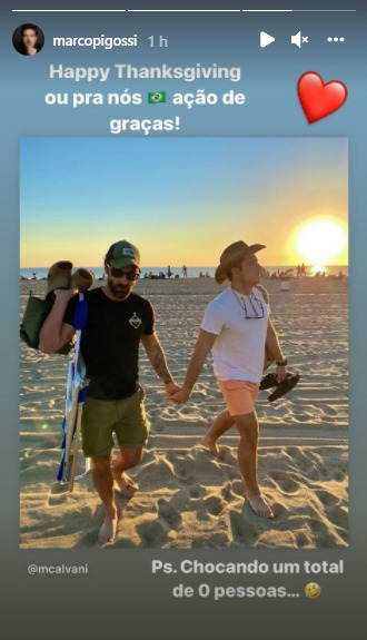 Em meio as agendas cheias, os dois se conheceram e se apaixonaram. Nesta quinta-feira, 25, é celebrado o Dia de Ação de Graças nos Estados Unidos e o casal comemorou a data junto. Marco publicou uma foto dos dois de mãos dadas com a legenda: “grato por isso”. Marco compartilhou a imagem nos stories do Instagram.