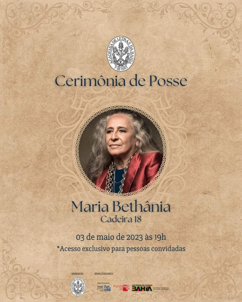 A cantora Maria Bethânia Vianna Telles Velloso, eleita imortal da Academia de Letras da Bahia em 11 de outubro de 2022, será empossada nesta quarta-feira (03) às 19 horas, em sessão solene no Palacete Góes Calmon presidida pelo acadêmico Ordep Serra, presidente da instituição. Maria Bethânia tem 76 anos de idade e mais de 55 anos de carreira na música.