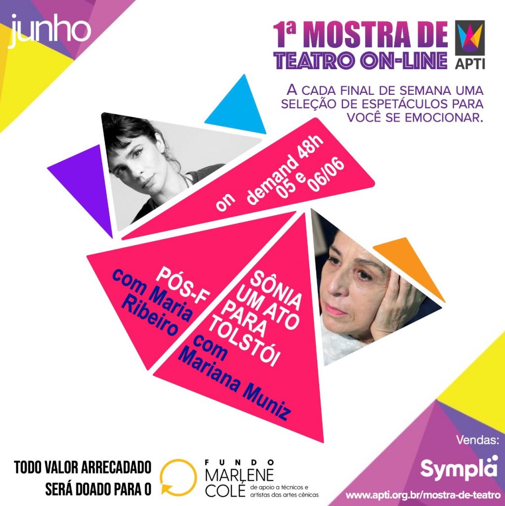 A 1ª Mostra de Teatro On-Line APTI segue estreia nos dias 5 e 6 de junho dois novos espetaculos no on demand. Dentre as atrações, a atriz Maria Ribeiro apresenta obra Pós-F, de Fernanda Young.