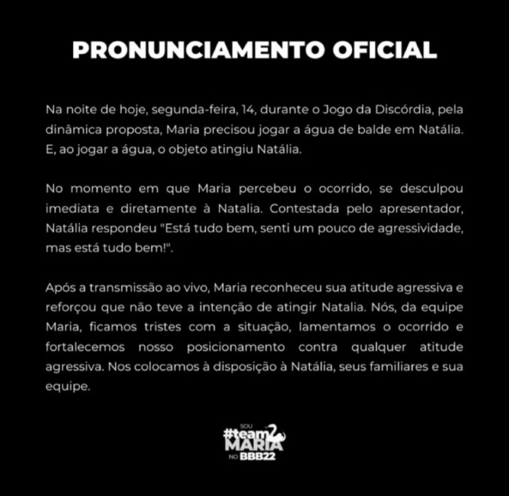 Nota da equipe de Maria sobre o ocorrido