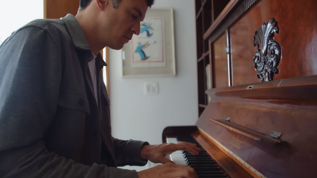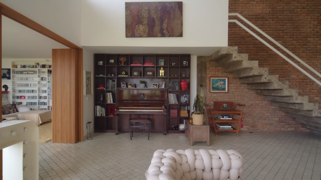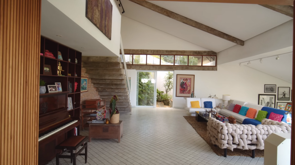 O ator faz a apresentação da sala e avisa que “é muita coisa bonita, mas muita coisa simples”. O ambiente conta com uma escada de cimento com tijolo da parede aparente, um sofá de alvenaria que já estava no local, juntamente com outros itens de decoração, como o baú e o piano. Mateus reforça que o ambiente é bastante arejado, conta com muito vidro para que entre luz e a natureza.