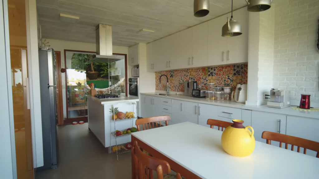 A cozinha, bastante funcional, misturou parte da decoração antiga com a modernidade de novos itens. O ambiente em que a família passa a maior parte do tempo é pequena, porém não abriu mão de portas e janelas amplas para que a luz mais uma vez entrasse no ambiente e deixasse claro e arejado. Para Paula, a casa se tornou o ponto de encontro dos amigos do filho Benjamim, o que ela acha bastante positivo. “É uma casa que acolhe as pessoas que a gente ama, que chama as pessoas para voltar. Eles sempre falam: vamos fazer de novo daqui um ano. Se sentem muito à vontade aqui. Eu gosto muito daqui”, relata Braun.