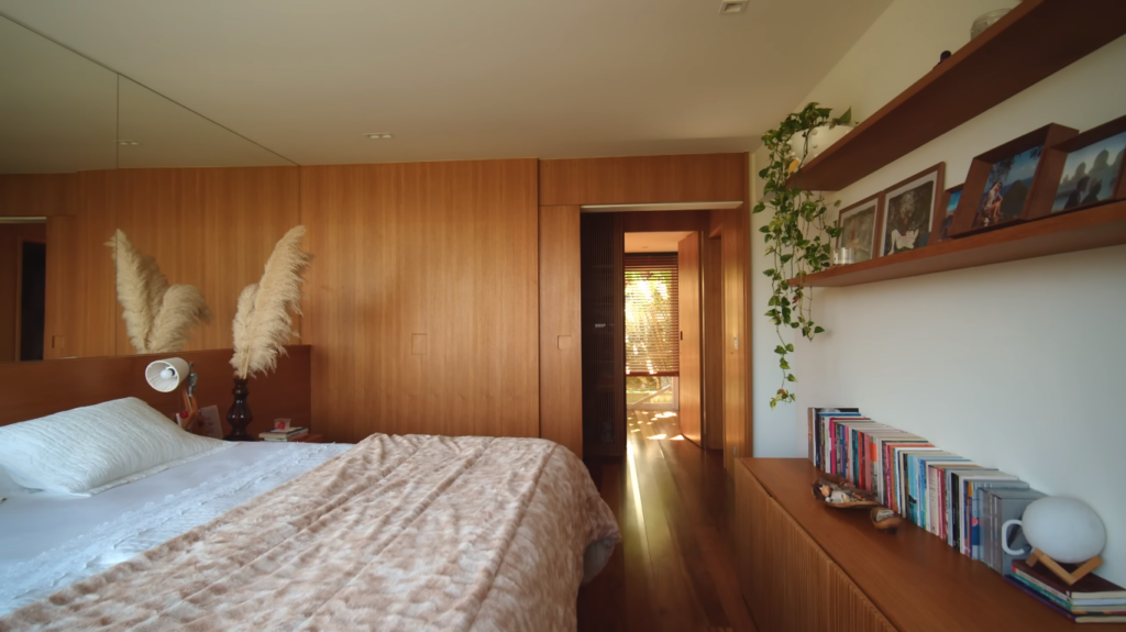 O quarto do casal é o único cômodo da casa que foi planejado para que o espaço fosse bem aproveitado. O espelho foi instalado para auxiliar no reflexo da luz natural no ambiente. A cama foi estrategicamente colocada em um ponto do quarto em que o casal tem vista privilegiada do mar. No banheiro, a luz natural e a natureza também entram através das janelas largas. A reforma comtemplou dois novos chuveiros, um deles, com menor saída de água para economizar, e ao fundo, uma banheira de pedra, um pedido de Paula.
