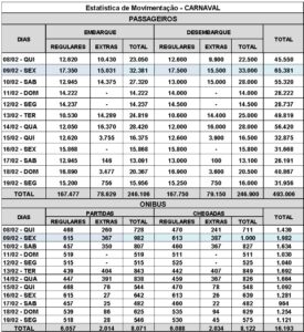 Do dia 8 ao dia 19 de fevereiro, a Rodoviária do Rio deverá registrar 493.006 viajantes em suas instalações. As 41 viações programaram quase 16193 mil ônibus nesse período para atender ao grande movimento de saída do Rio. 4048 extras A sexta-feira (09/02) será o dia com maior saída da cidade com 32381 mil embarques e 33 mil desembarques. Quem quiser viajar deve garantir a sua passagem com antecedência visto que esse é um dos períodos com maior movimentação do ano. Os destinos mais procurados são as cidades praianas, serranas e da Costa Verde do Estado do Rio, além de MG, SP e ES. Estas últimas regiões também são responsáveis pelo maior número de desembarques de turistas que devem passar o feriado de Carnaval no Rio.