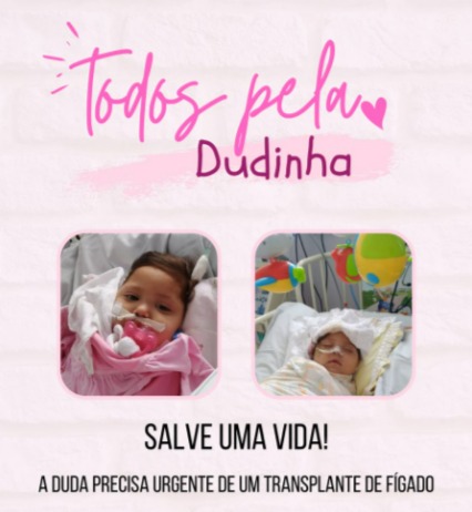 A Duda nasceu com microcefalia e uma síndrome rara chamada ‘atresia de vias biliares’ (AVB), que é uma doença no fígado e ductos biliares. Por conta desse diagnóstico, a menina precisa com urgência de um transplante de fígado e um doador de sangue tipo O.