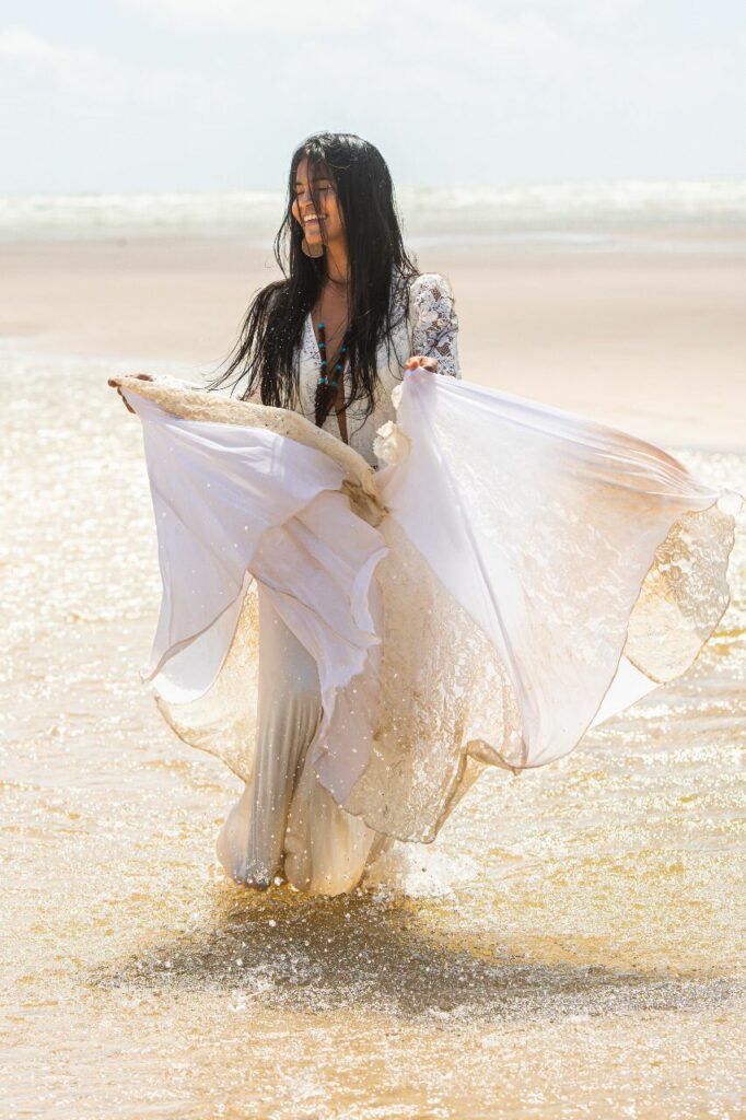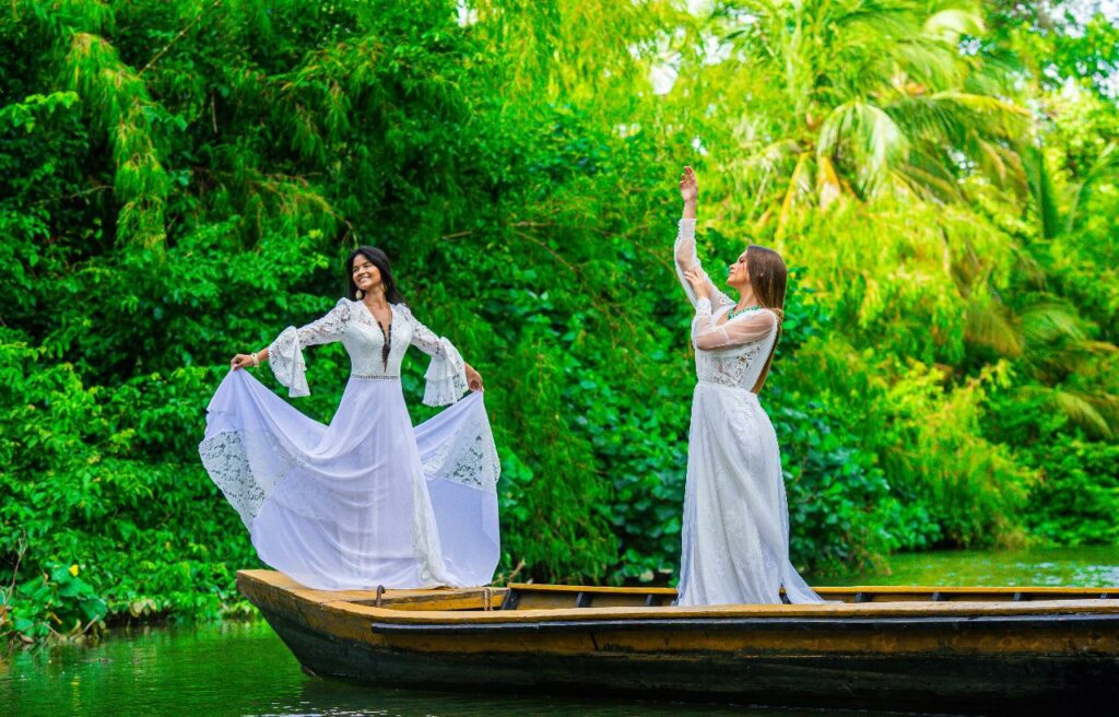 Foram escolhidas duas modelos, uma de pele branca e outra modelo de origem indígena para fotografarem o editorial na Ilha do Marajó (PA). “Fomos por esse caminho e trouxemos muita brasilidade, com muito luxo dos vestidos de noiva com cortes e rendas francesas usadas no editorial e fotografados pelo fotógrafo internacional Leonardo Queiroz”, completa.