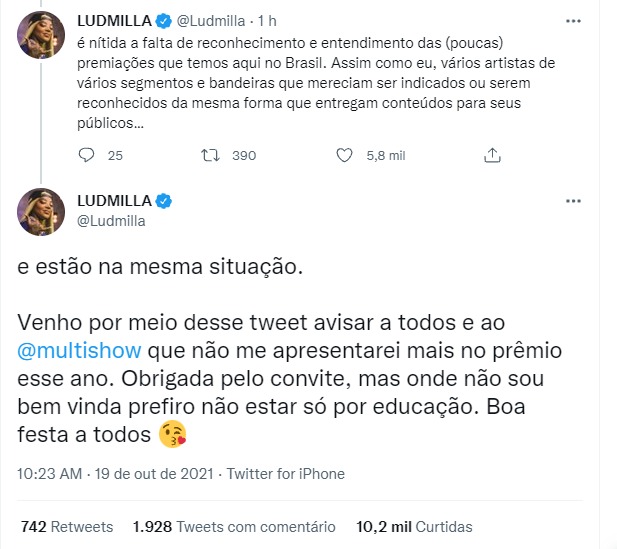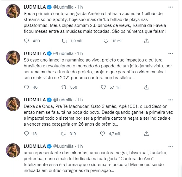 Os números falam por si só e olhando assim dá para se entender a revolta dos fãs, críticos e da própria cantora, que cancelou a apresentação que faria no prêmio — que será realizado no dia 8 de dezembro. Agora é aguardar o posicionamento da emissora sobre a exclusão de Ludmilla, que seguirá fazendo grande sucesso mesmo sem a indicação.