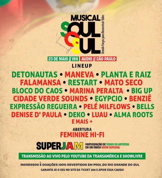 Em um formato de SuperJam, o evento solidário tem transmissão a partir das 20h30, diretamente da casa de show Audio, em São Paulo. No line-up, nomes como Restart, Detonautas, Falamansa, Maneva, Planta & Raiz, Marina Peralta, Expressão Regueira, Bloco do Caos, Mato Saco, Big Up e Egypcio, entre outros ícones da indústria. A arrecadação dos fundos pretende contribuir nesse início de reconstrução das áreas afetadas pelas enchentes que assolam mais de 450 municípios gaúchos.