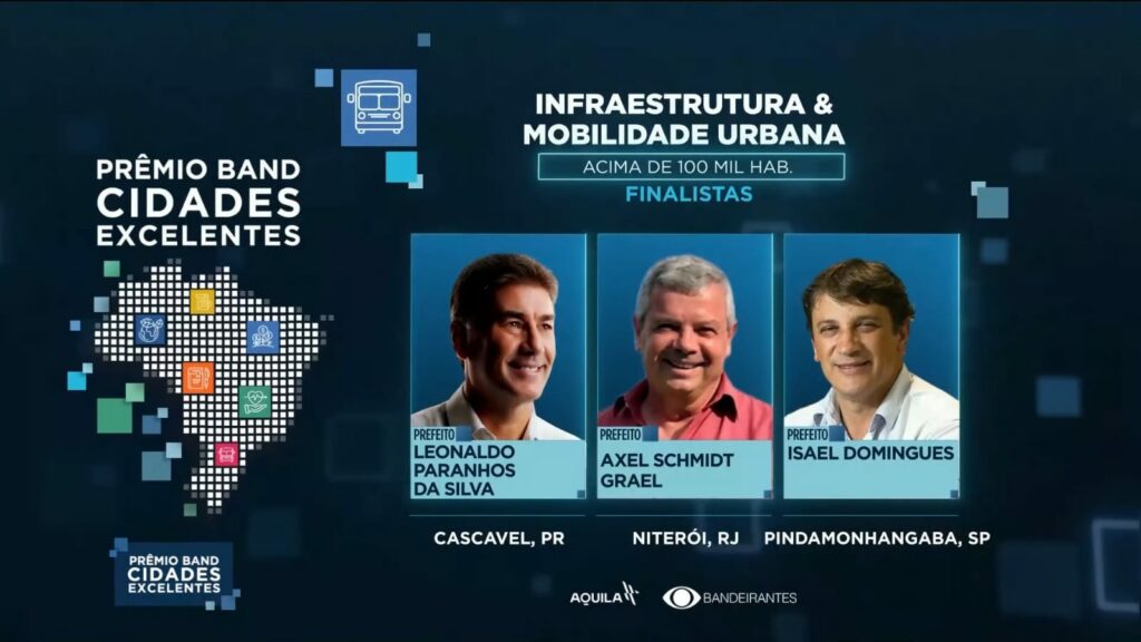 O Grupo Bandeirantes de Comunicação e o Insituto Áquila premiaram, na noite desta quarta-feira (30), as Cidades Excelentes. O evento contou com seis categorias, entre elas Infraestrutura e Mobilidade Urbana em que Niterói (RJ), Pato Branco (PR) e São Sebastião da Grama (SP) foram destaques.