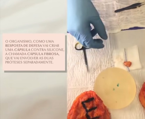 “Corra atrás e se informe porque o silicone pode te deixar muito doente, como tem me deixado. Nós sabemos que o nosso corpo reage a qualquer coisinha [que entra nele]. Nosso corpo cria uma resposta de defesa e começa a criar uma cápsula [cápsula fibrosa] em volta do silicone, isso vai acontecer em 100% das mulheres que colocarem as próteses, é um processo natural de defesa. Conforme vai passando o tempo, o gel [do silicone] passa a entrar em contato com a cápsula e isso ativa células de defesa para eliminar, mas como o corpo se livra da inflamação se são 2 bolas de plástico enormes dentro da gente? Ele meio que desiste e as pessoas podem ficar assintomática por um período, até que a pessoa tem dermatite, queda de cabelo, artrite”, explicou Renata.