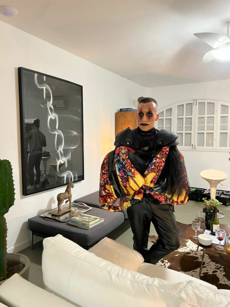 O outfit que combinava um mini-casaco estruturado estampado com camisa transparente, calça de couro e luvas. O clã-finale fica por conta da maquiagem que traz essa estética do palhaço mal para o visual do ex-apresentador do reality Les Angels.