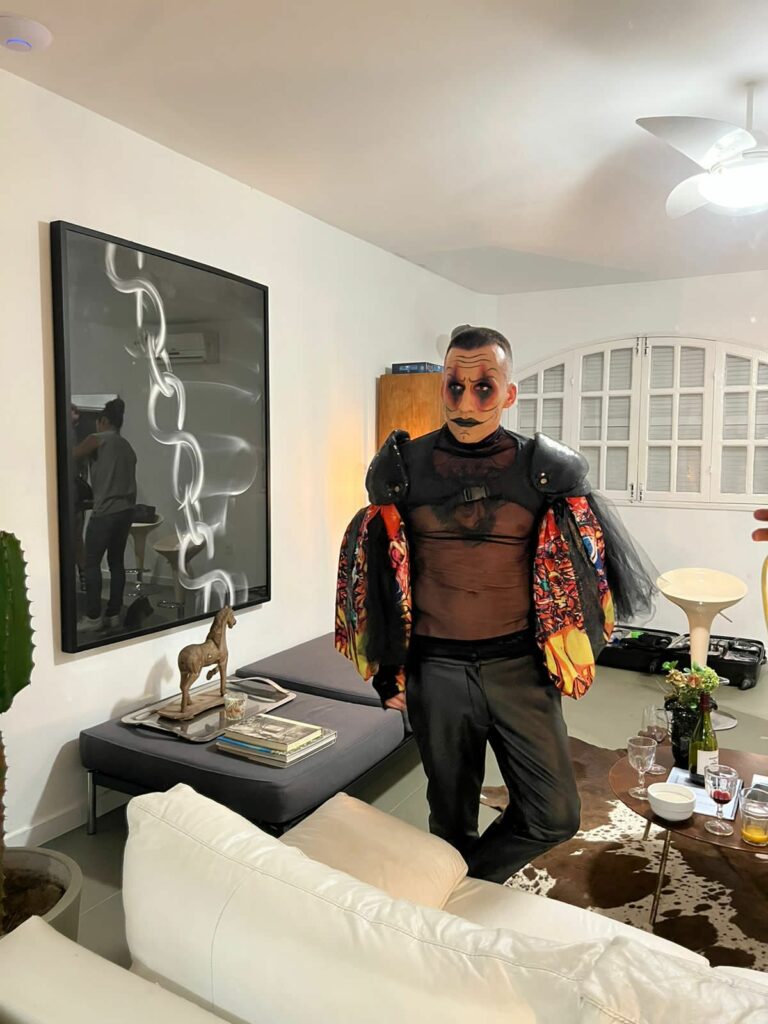 Para a sua primeira vez no Baile de Halloween do Copacabana Palace, o apresentador Benjamin Cano investiu em um look baphonico assinado pelo stylist Caian Rangel. O stylist explicou que a estampa usada no look teve como referência os bate-bolas, que é uma fantasia muito comum nos subúrbios cariocas durante o carnaval.