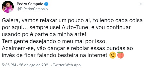 Nesta semana Pedro Sampaio virou chacota no Twitter após um usuário compartilhar um vídeo dele no programa “Música Boa” da Ivete Sangalo, no Multishow. Os internautas disseram que estava visível que o DJ estava usando auto-tune, que é um programa usado para melhorar a voz, e ele confirmou.