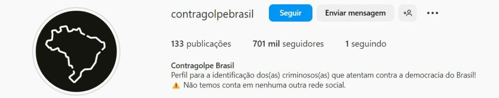 Após bolsonaristas radicais invadirem e depredarem o Palácio do Planalto, o Supremo Tribunal Federal (STF) e o Congresso Nacional no último domingo (8), o perfil “Contragolpe Brasi” foi criado no Instagram com o objetivo de identificar os golpistas que participaram dos atos de vandalismo. A conta que tem 133 publicações, já possui 701 mil seguidores.
