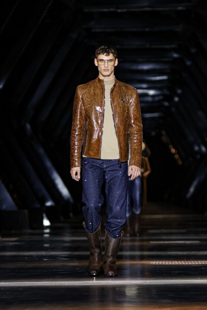 A moda permite dois ou mais universos bem distintos se conectarem, como no Milan Fashion Week. Um mundo ocidental onde cromados, cores e estampas da coleção se misturam. Os modelos incorporam personagens que transportam o mundo ocidental para um tom punk rock reinterpretado por Philipp Plein, dando-lhe um toque contemporâneo e maximalista.