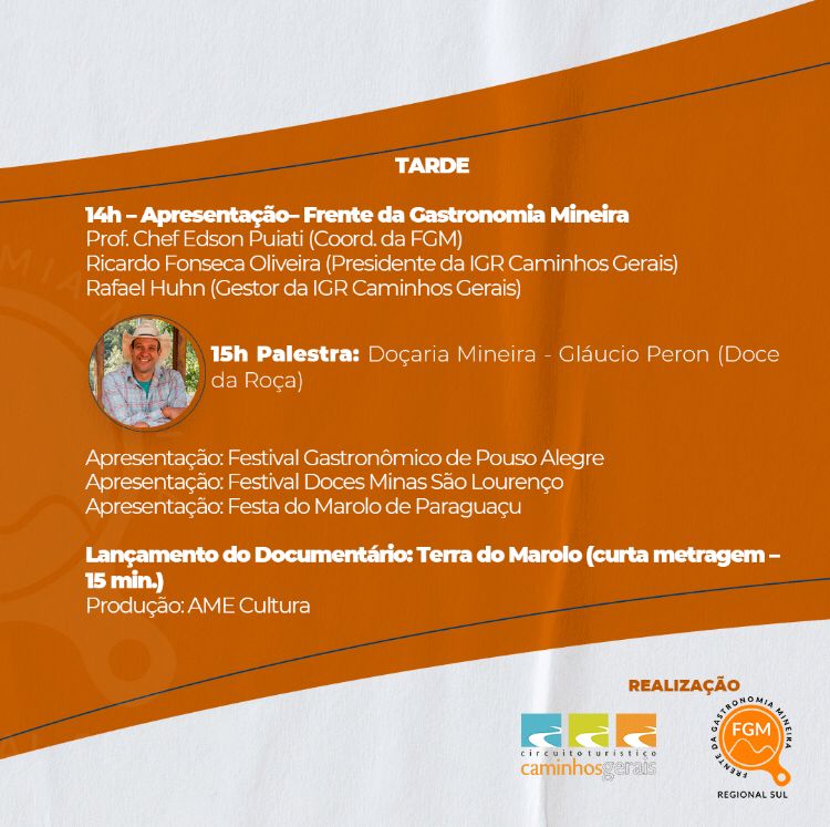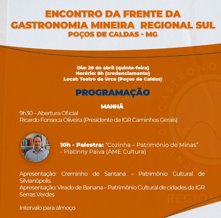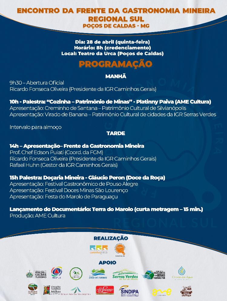 Para o lançamento da regional Sul da FGM, será realizado um evento, sendo um dia de muita troca de informações e experiências, como palestras de valorização da cozinha como patrimônio cultural, doçaria mineira e sua luta de resistência e apresentação de cidades e iguarias. O evento acontece no dia 28 de abril, com início as 9h, no espaço do Urca em Poços de Caldas – MG. Segue a programação.