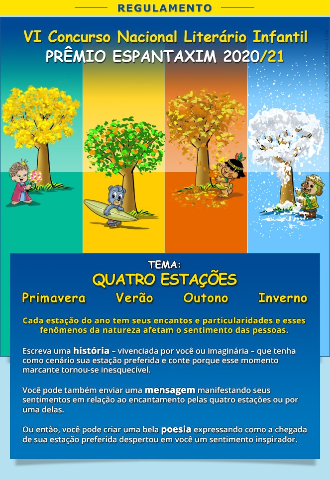Em comemoração aos dezenove anos de atividades culturais do Projeto Espantaxim, idealizado pela autora e escritora Dulce Auriemo, o VI Concurso tem como tema as “Quatro Estações — Primavera, Verão, Outono e Inverno. Cada estação do ano tem seus encantos e particularidades e esses fenômenos da natureza afetam o sentimento das pessoas”.