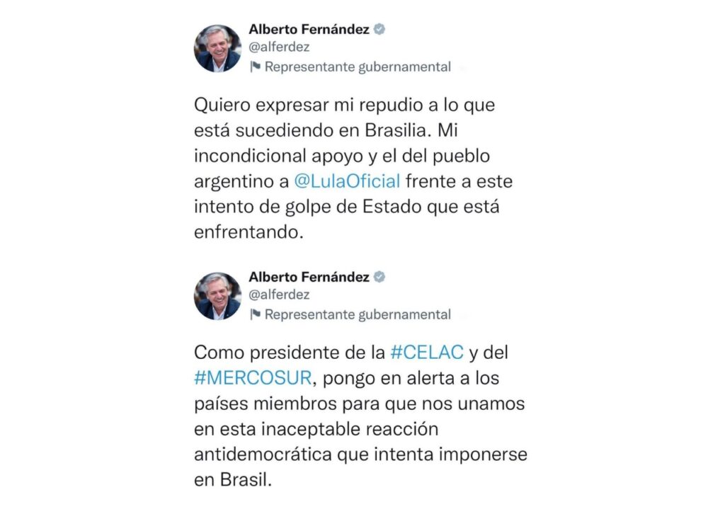 “Quero expressar meu repúdio ao que está acontecendo em Brasília. Meu apoio incondicional e do povo argentino para Lula frente a esta tentativa de golpe de Estado que enfrenta”, declarou Fernández, em seu perfil no Twitter, e prosseguiu: “Como presidente da Celac (Comunidade de Estados Latino-Americanos e Caribenhos) e do Mercosul (Mercado Comum do Sul), coloco os países membros em alerta para que nos unamos nessa inaceitável reação antidemocrática que está tentando se impor no Brasil”.