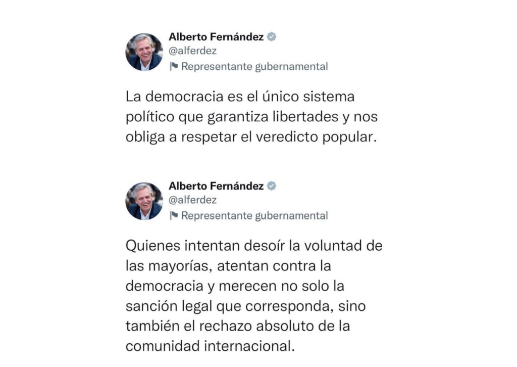 “Aqueles que tentam não ouvir a vontade das maiorias, atentam contra a democracia e merecem não só uma sanção legal, mas também a rejeição absoluta da comunidade internacional. Como presidente da CELAC e do Mercosul, alerto os países-membros para que nos unamos contra esta inaceitável reacção antidemocrática que se tenta impor no Brasil”, advertiu o Presidente argentino, Alberto Fernández.