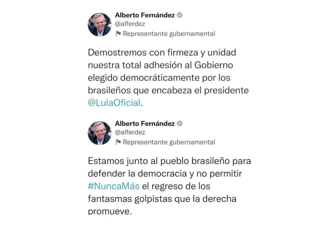 “Quero expressar o meu incondicional apoio e do povo argentino a Lula perante esta tentativa de golpe de Estado. Estamos juntos do povo brasileiro para defender a democracia e para não permitir nunca mais o regresso dos fantasmas golpistas que a direita promove”, acusou Alberto Fernández, convocando os países latino-americanos a reagiro em conjunto