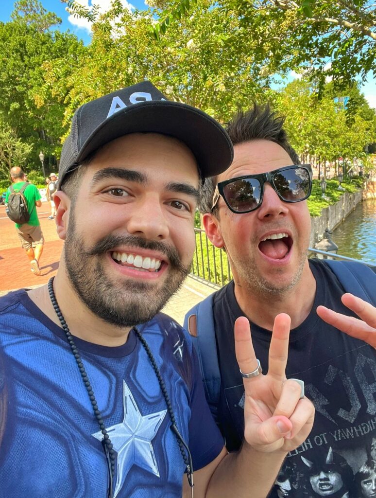 Felipe Zapa posa ao lado de Pierre Bouvier e comemora encontro presencial com o cantor na Disney