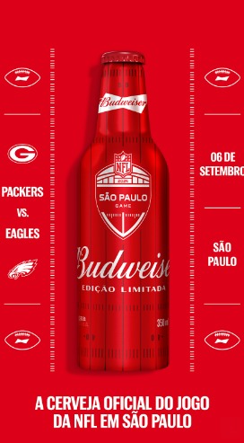Budweiser, parceira global da National Football League (NFL) americana, foi nomeada patrocinadora oficial do primeiro jogo da NFL em São Paulo. O confronto, que colocará frente a frente os times Philadelphia Eagles e Green Bay Packers, acontecerá na Neo Química Arena no dia 6 de setembro. Para celebrar este marco histórico, a Budweiser lançará uma garrafa colecionável de alumínio de 350ml com design único, inspirada na emocionante partida.