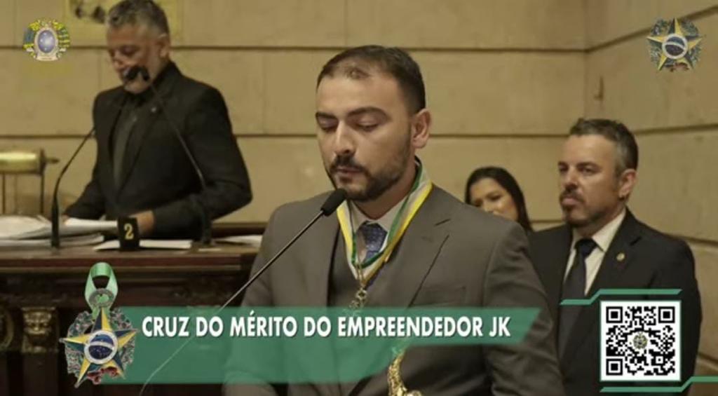 João Souza, idealizador do aplicativo de faxinas Aloha Smart Tech, recebeu o prêmio mais importante da noite ontem (12) durante cerimônia na Câmara Municipal do Rio de Janeiro. A premiação Cruz do Mérito do Empreendedor JK tem como principal objetivo reconhecer e fomentar o empreendedorismo brasileiro. Além de receber medalha como outros empreendedores presentes, João recebeu o troféu JK, maior prêmio da noite, das mãos do ator, cantor e campeão do BBB22, Arthur Aguiar.