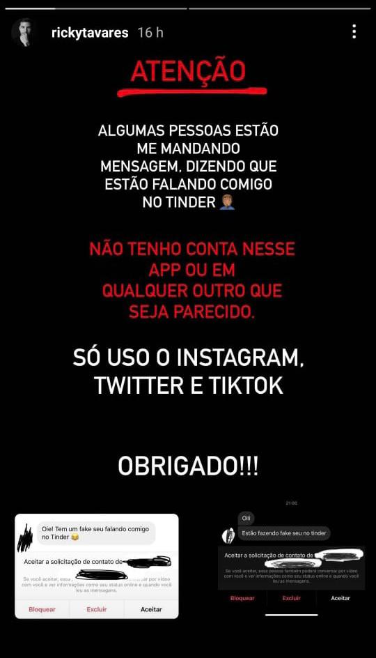 Pelo Instagram, Ricky alertou sobre não ter nenhum perfil verdadeiro no aplicativo de paquera. “Algumas pessoas estão me mandando mensagem dizendo que estão falando comigo no Tinder”, comentou.