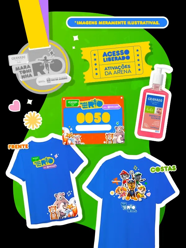 As inscrições darão direito a um kit especial para a garotada com camiseta, número de peito, medalha, sabonete líquido Calêndula – lançamento da Granado Bebê – e uma pulseira-guia para quem participar das categorias de 100m e 200m. Os responsáveis também poderão comprar de maneira antecipada um pacote de fotos da FOTOP, que registrará as melhores imagens dos pequenos corredores.