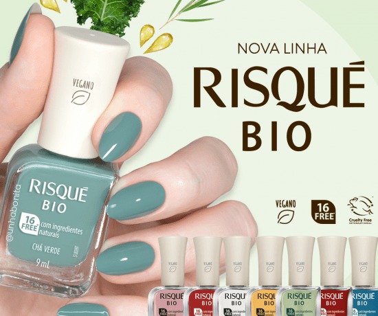 Líder no mercado de esmaltes e pertencente ao Grupo Coty no Brasil, a Risqué apresenta sua nova linha Risqué Bio, vegana e com ingredientes naturais. A nova linha contém produtos que não utilizam ingredientes de origem animal e também é aprovada pelo programa Leaping Bunny da Cruelty Free International e 16 free (livre de 16 ingredientes com potencial alergênico).