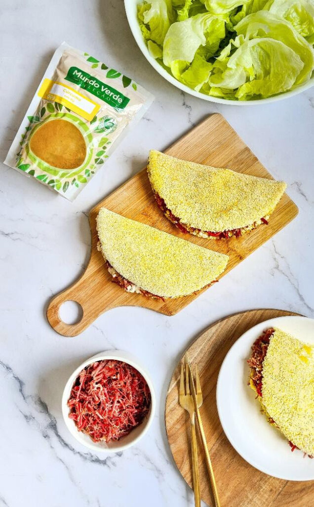 Tapioca com cúrcuma recheada de carne seca, ricota e tomates