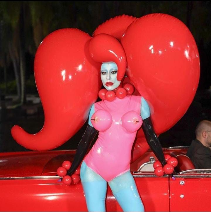 O look da apresentadora foi todo confeccionado em látex, com body rosa com seios infláveis, arranjo de cabeça gigante e nos pés saltos de 22cm de altura. O styling ficou por conta de Pedro Sales e a make por Krisna.