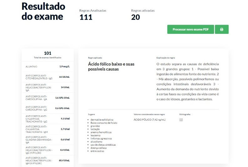O software, por conta de seu motor agnóstico, permite o processamento de mais de 800 laboratórios nacionais, americanos, chilenos, portugueses, americanos, espanhóis, emirados árabes, entre outros. Ao usar valores ideais e não os de referência, o software identifica índices que estão próximo dos limites, evitando o quadro clínico do paciente desfavorável. Com isto, o profissional de saúde terá tempo de atuar para que doenças, principalmente as crônicas, não se desenvolvam.